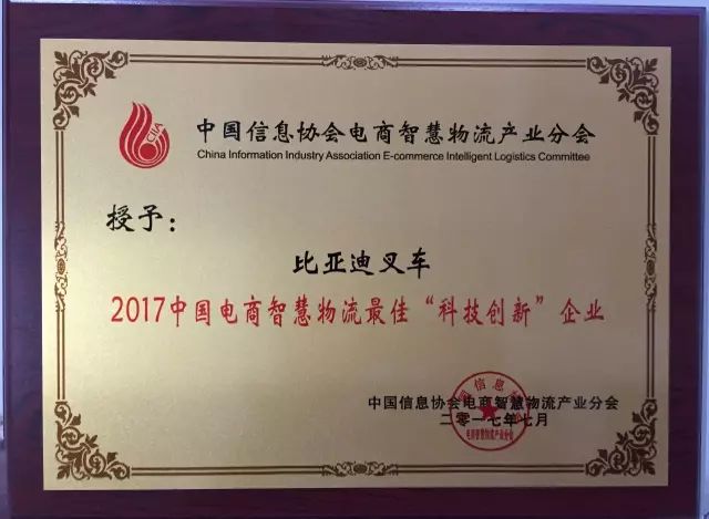 2017年7月28日,中国电商智慧物流科技创新发展论坛在北京成功召开。论坛以“科技创新,助力电商智慧物流”为主题,京东物流、阿里云、比亚迪、中仓网、上上签等知名企业代表及电商物流相关政府机构人员出席了此次盛会,论坛现场同时还评选出了在智慧物流领域中做出显著成绩的企业及在智慧物流科技创新应用中具有推广价值的优秀品牌。比亚迪叉车作为新能源叉车的开拓者,凭借着独有的技术优势,荣获2017中国电商智慧物流最佳“科技创新”企业大奖。